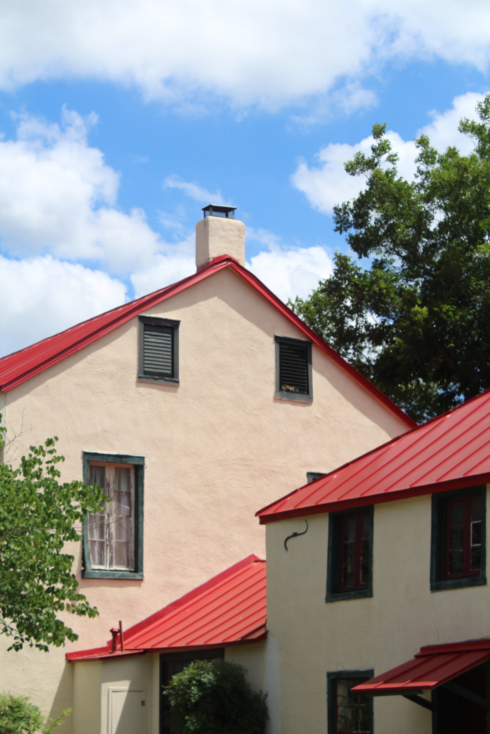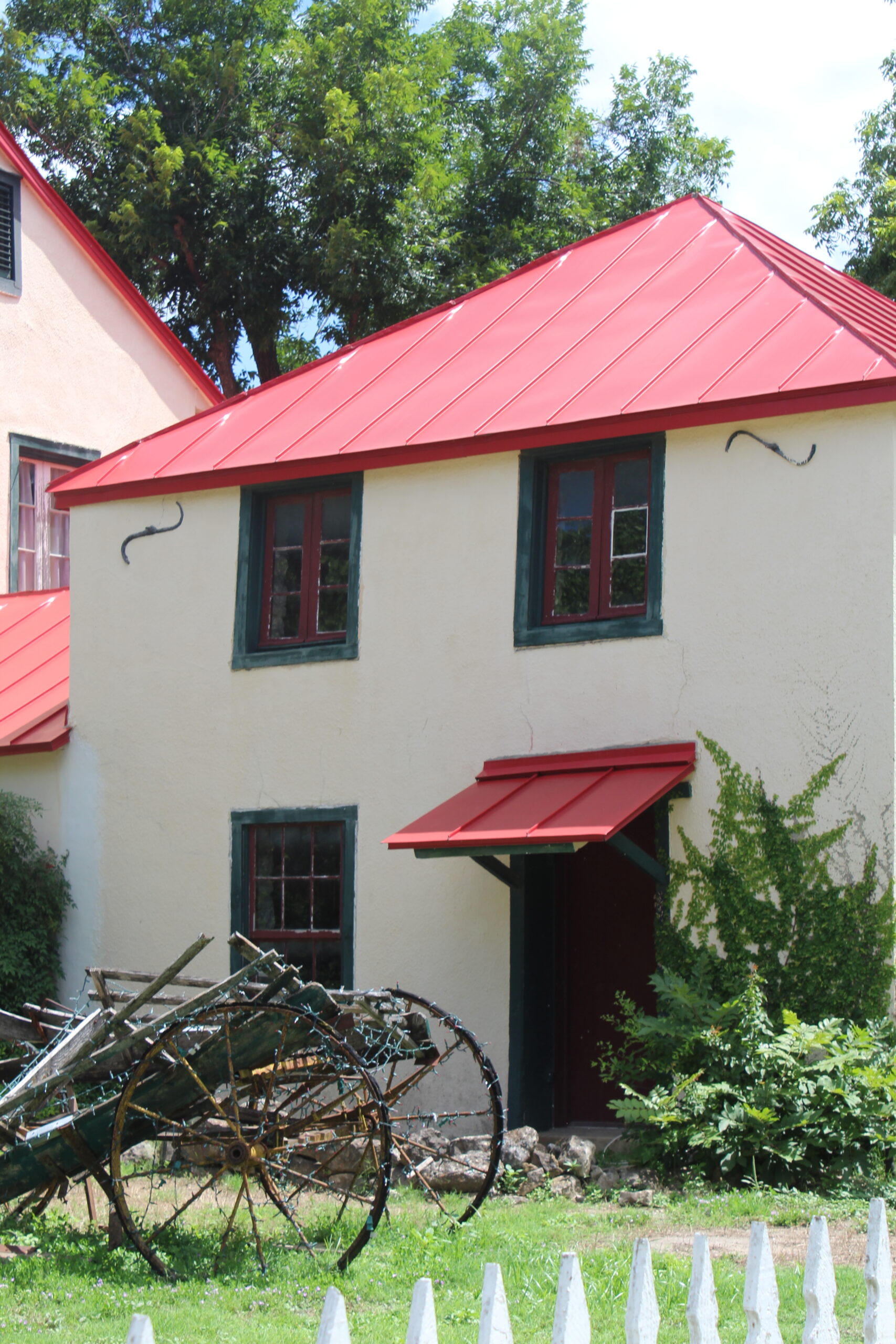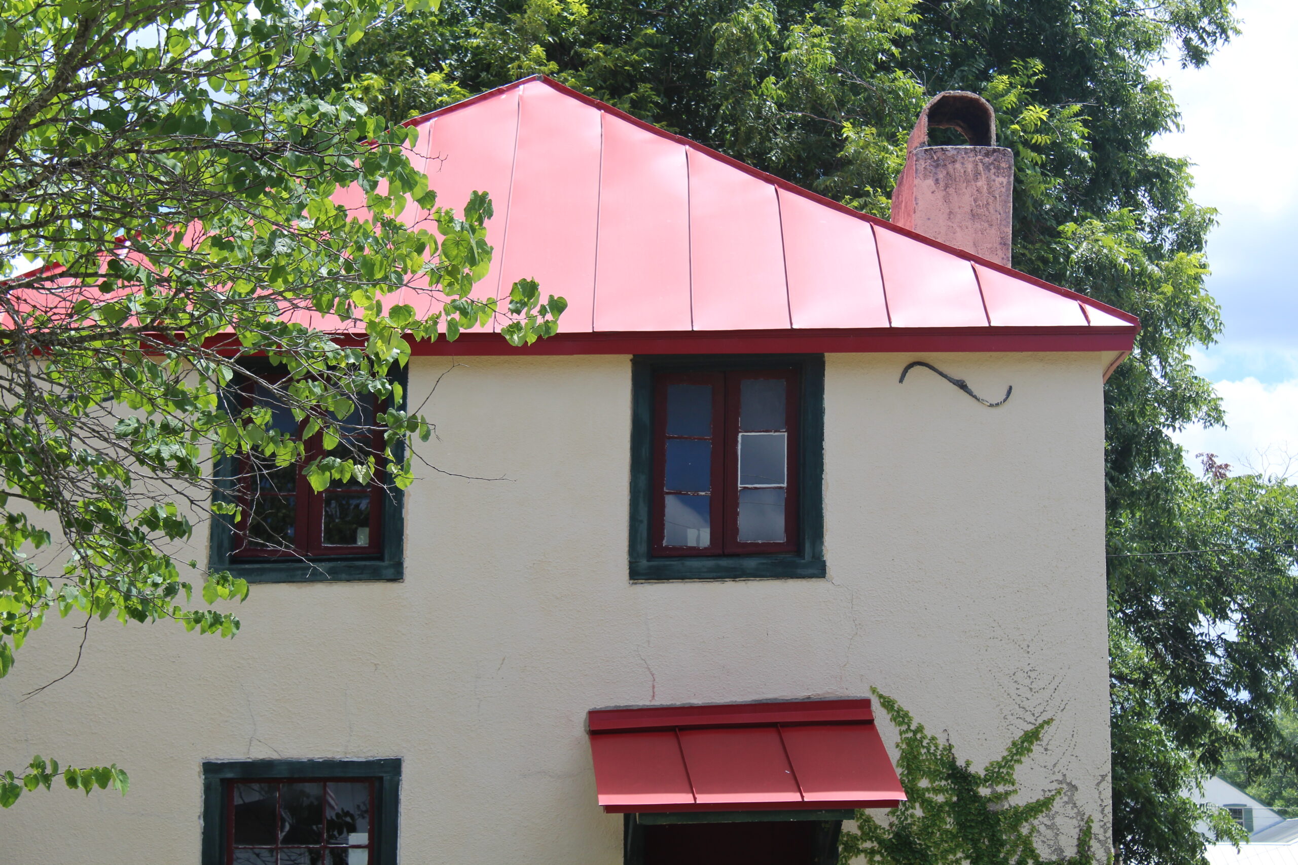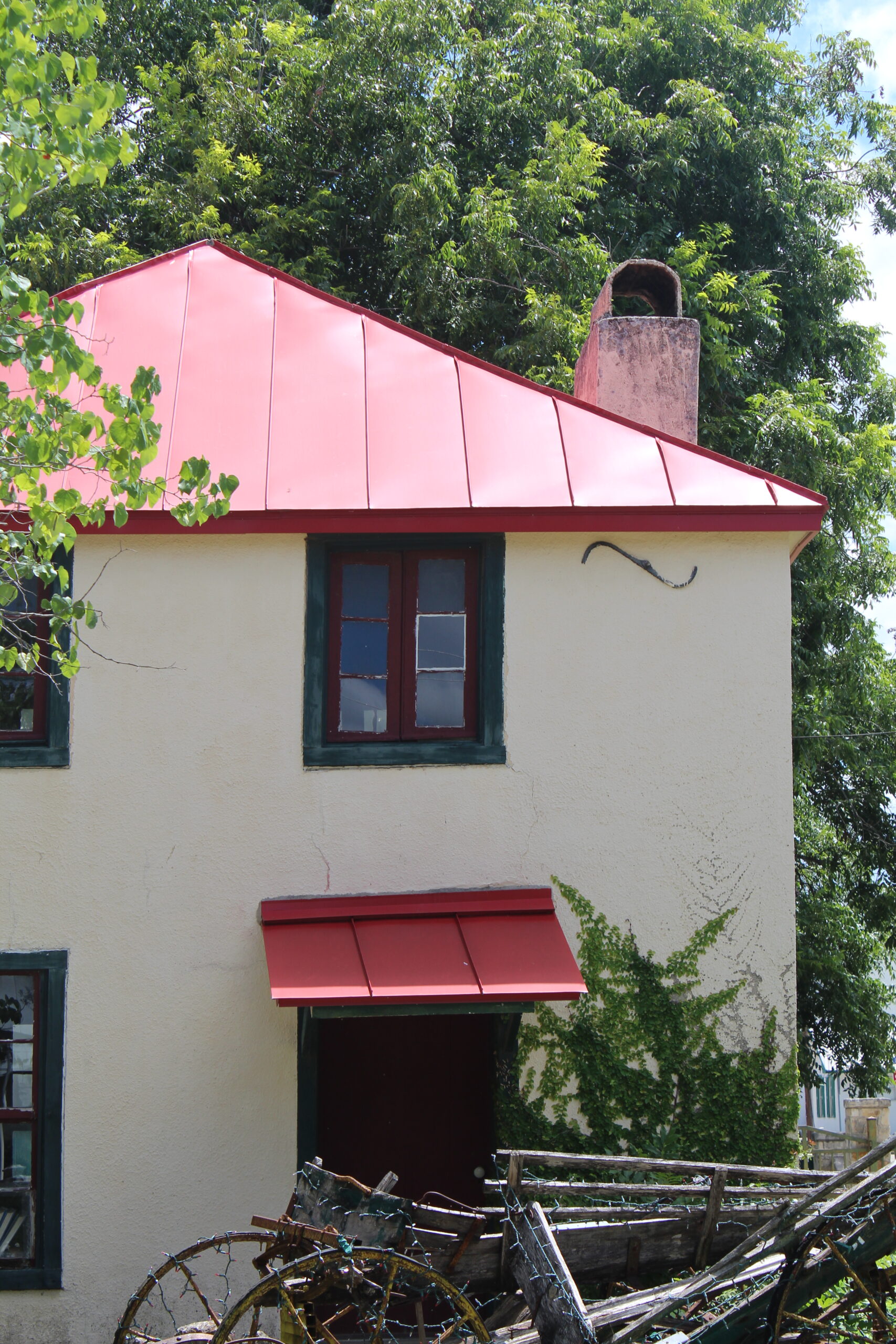 The secondary volume also has a metal, standing seam roof but is instead hipped. Its front and back facades both have two bays with two openings on each floor. The door on the front facade’s first floor is shielded by an awning. This part of the structure once housed the hotel’s servants and consisted of two floors as indicated by the wood still present in the stone walls. Its ceiling reveals the original wooden roof structure.