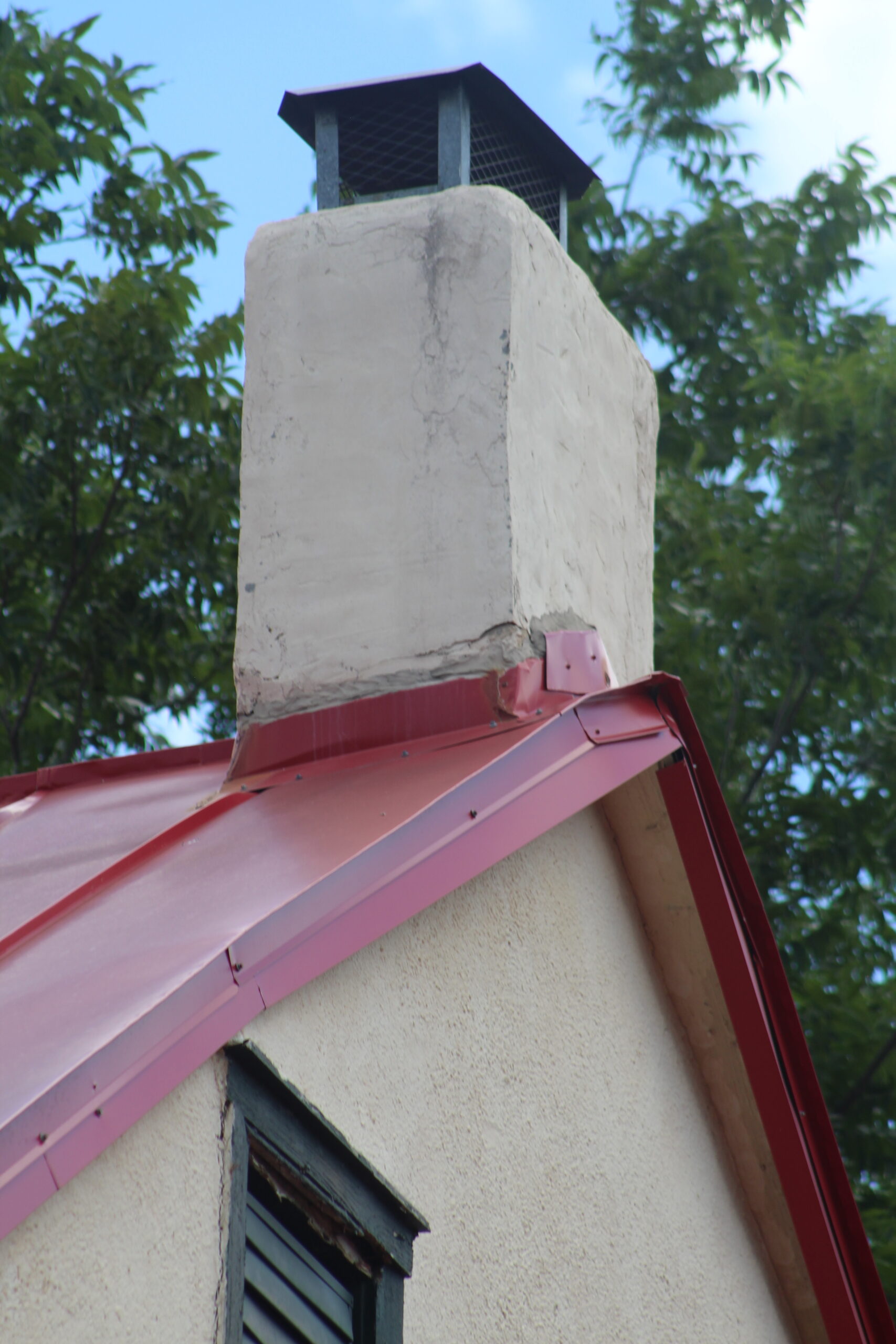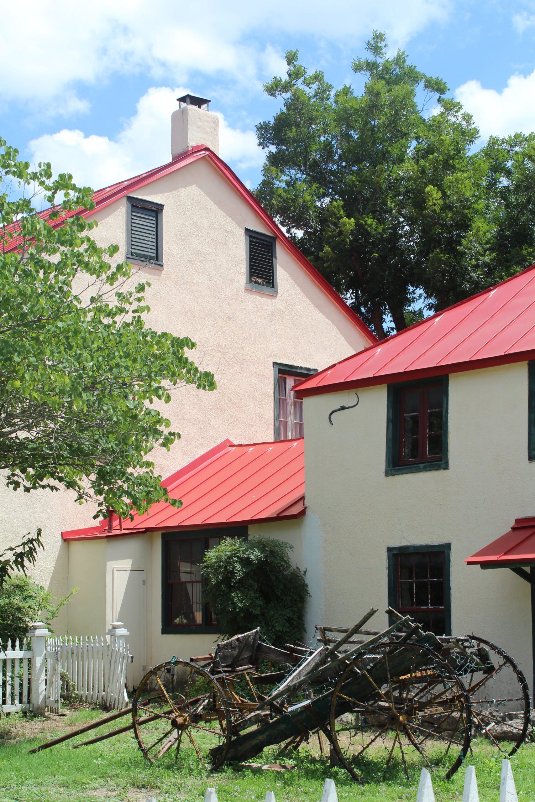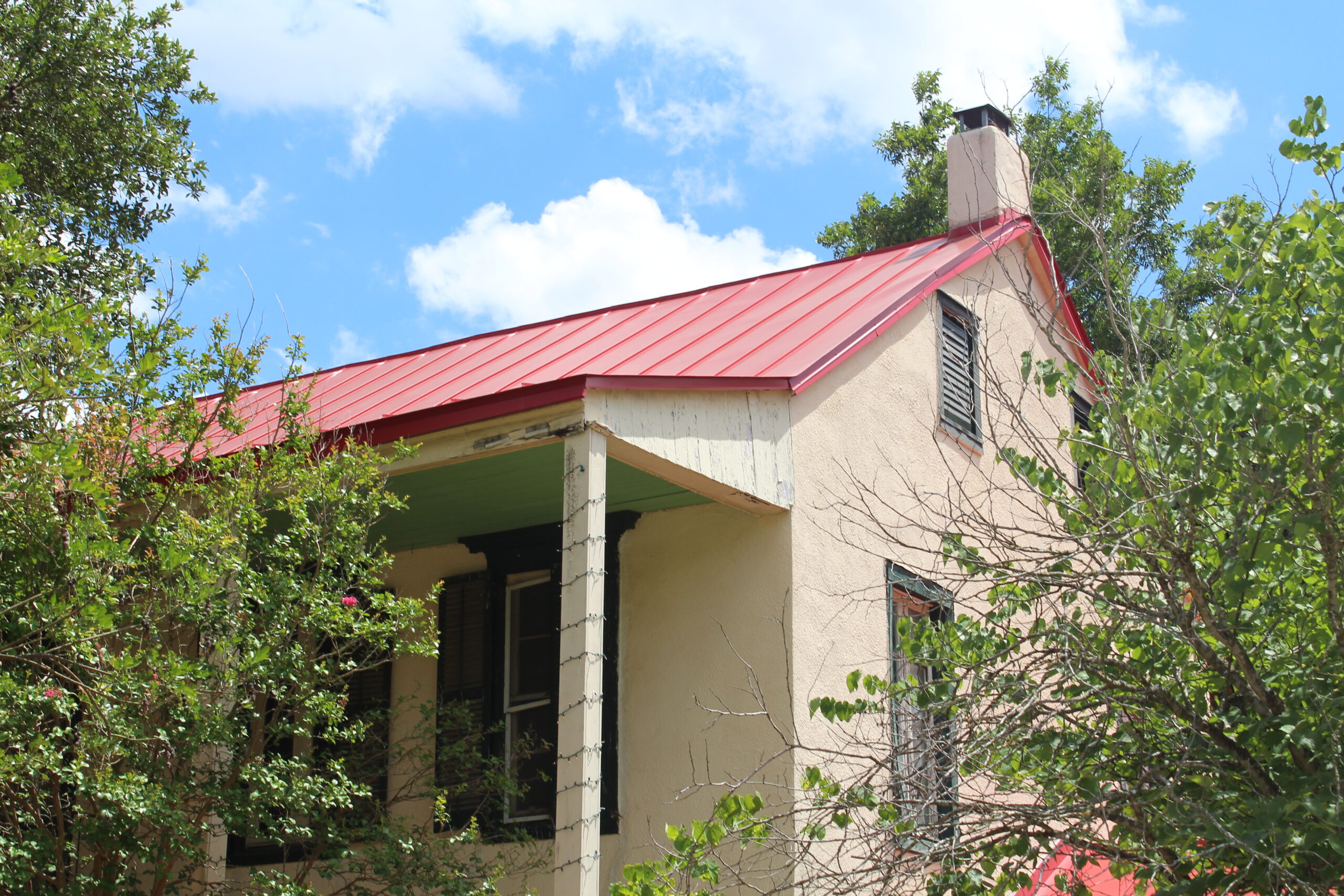 The secondary volume also has a metal, standing seam roof but is instead hipped. Its front and back facades both have two bays with two openings on each floor. The door on the front facade’s first floor is shielded by an awning. This part of the structure once housed the hotel’s servants and consisted of two floors as indicated by the wood still present in the stone walls. Its ceiling reveals the original wooden roof structure.
