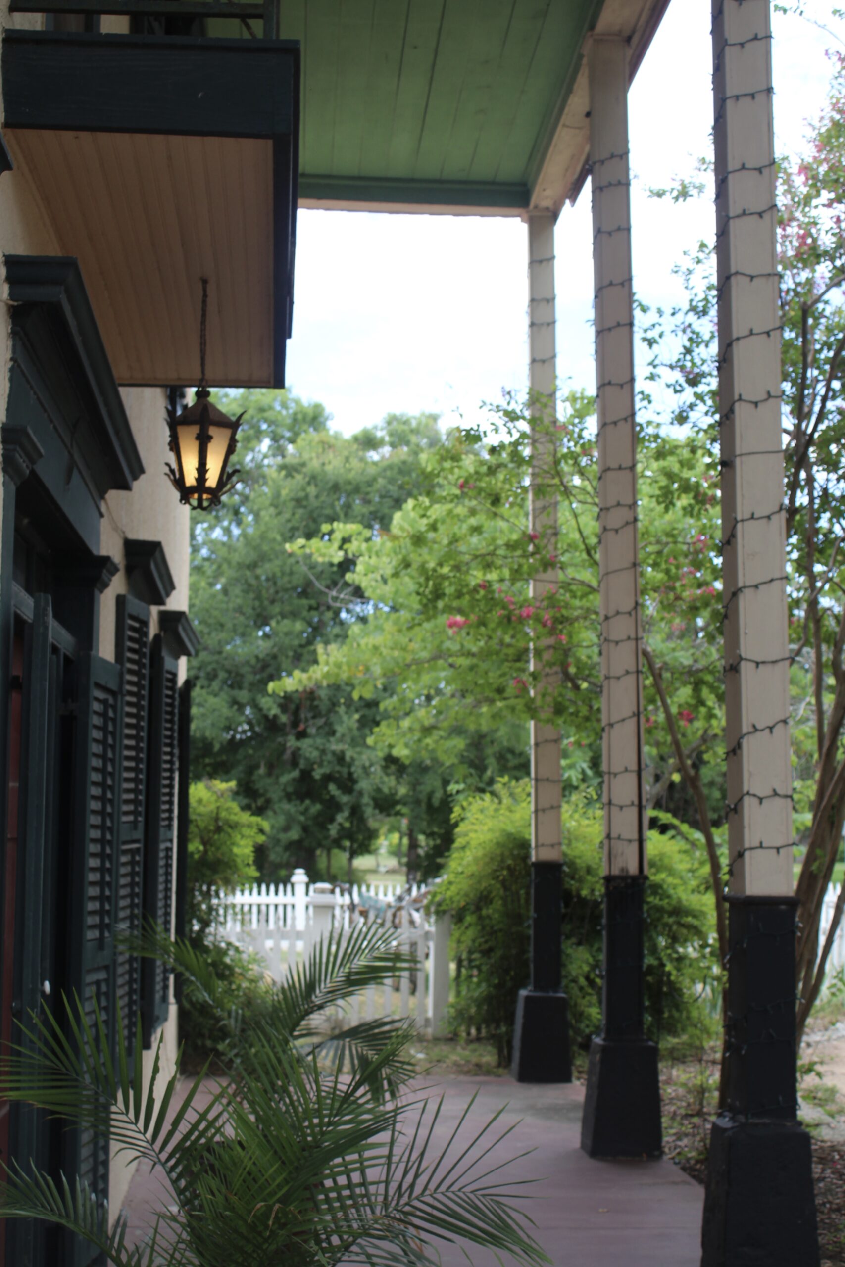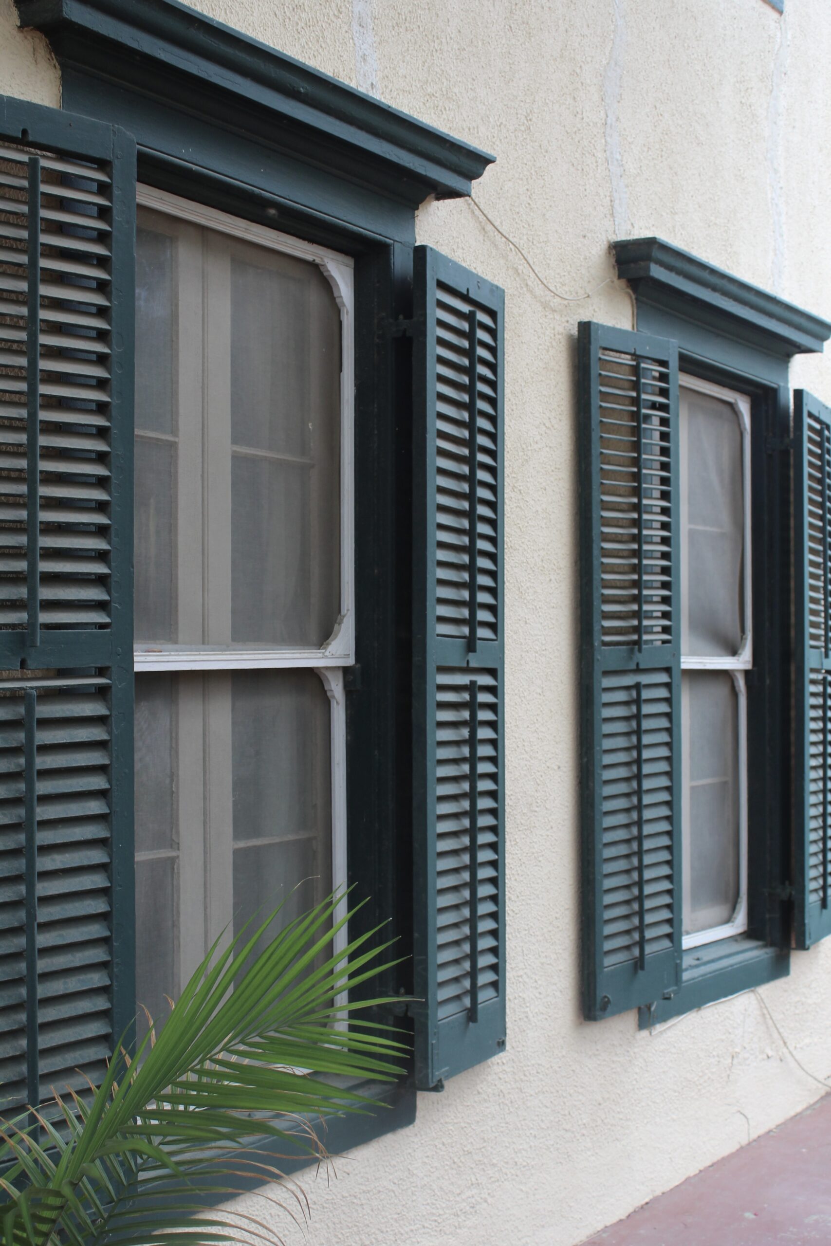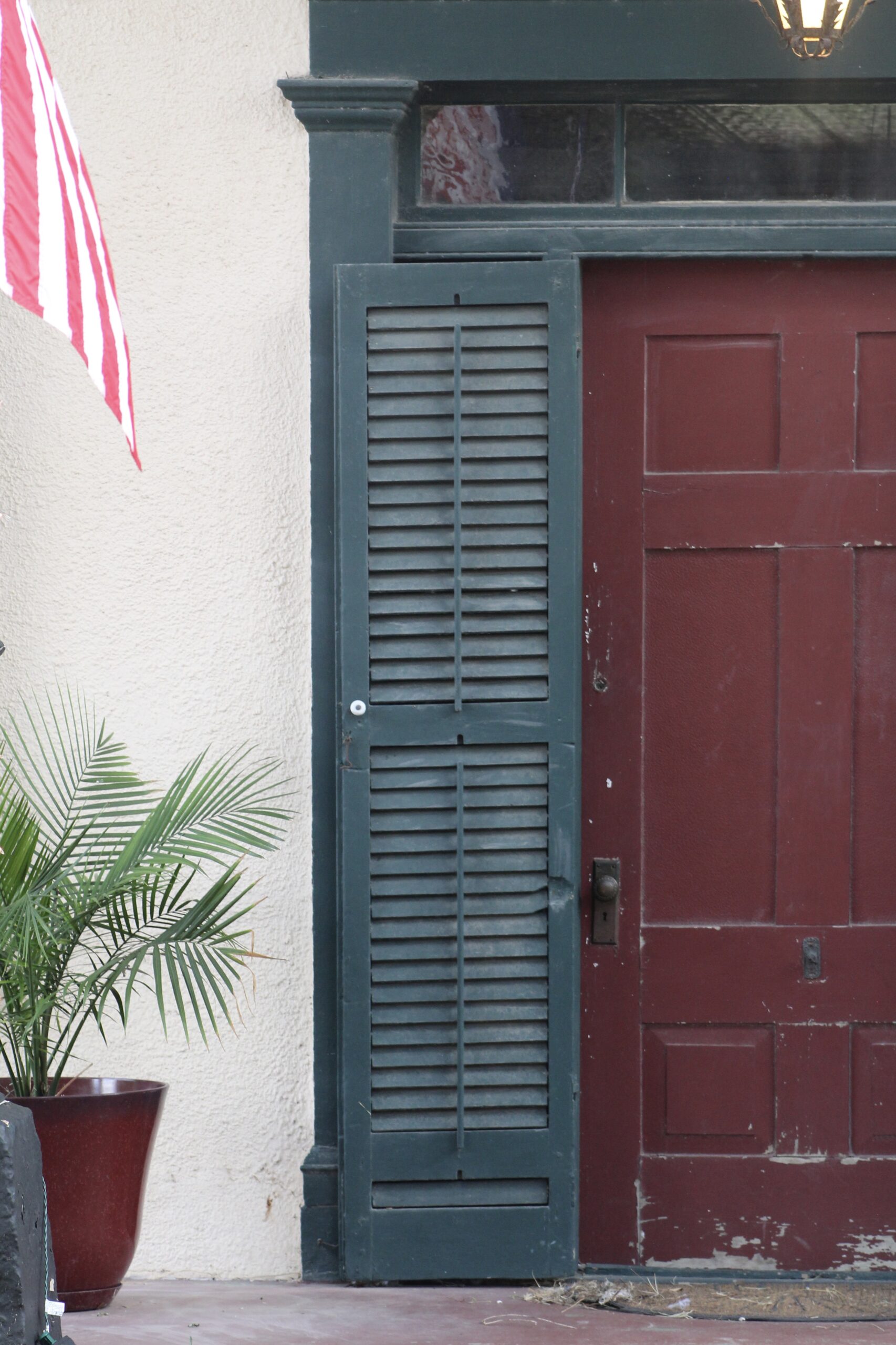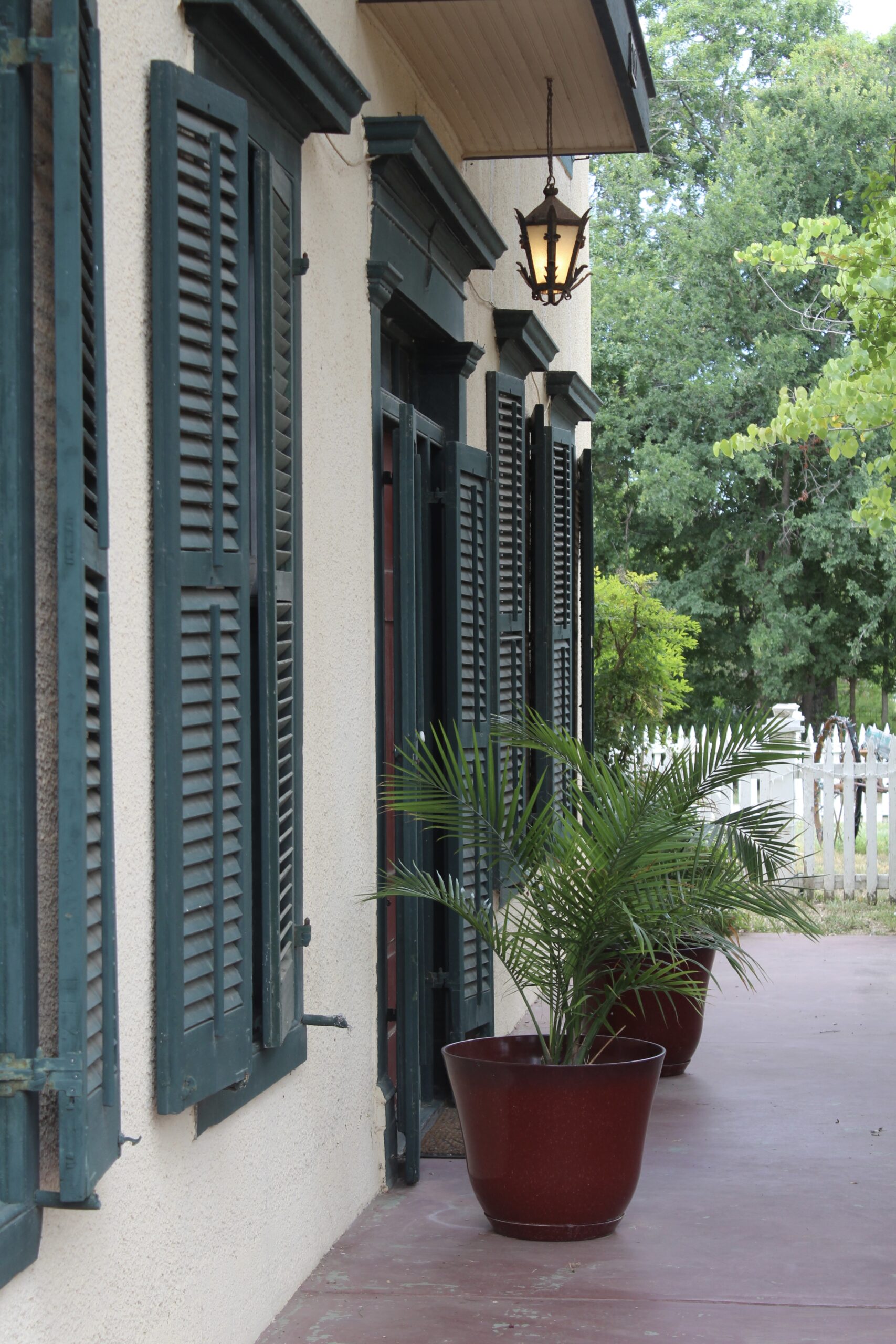 The hotel boasts a symmetrical, five-bay facade with a central door on both floors. The door at ground level is framed by sidelights and a transom window covered by shutters. The upper story door once opened to a pronounced balcony. The casement windows are protected by screens and are framed by functional shutters.