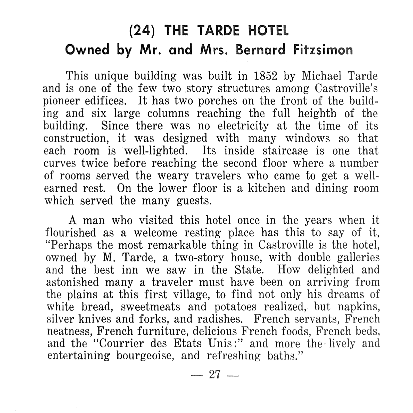 Victor Tarde built the Tarde Hotel in 1952. Born in France in 1792, Tarde was a member of the Young Guard of Napoleon Bonaparte.