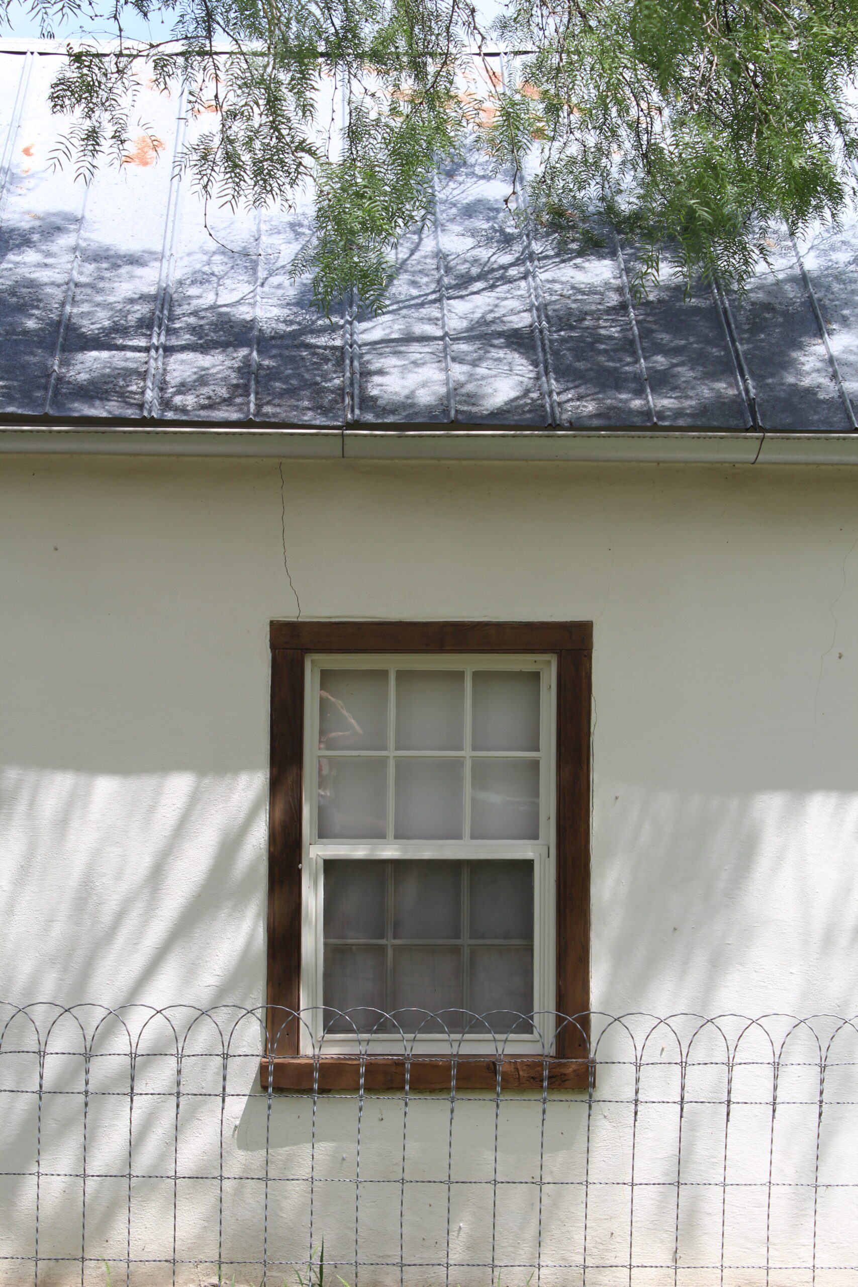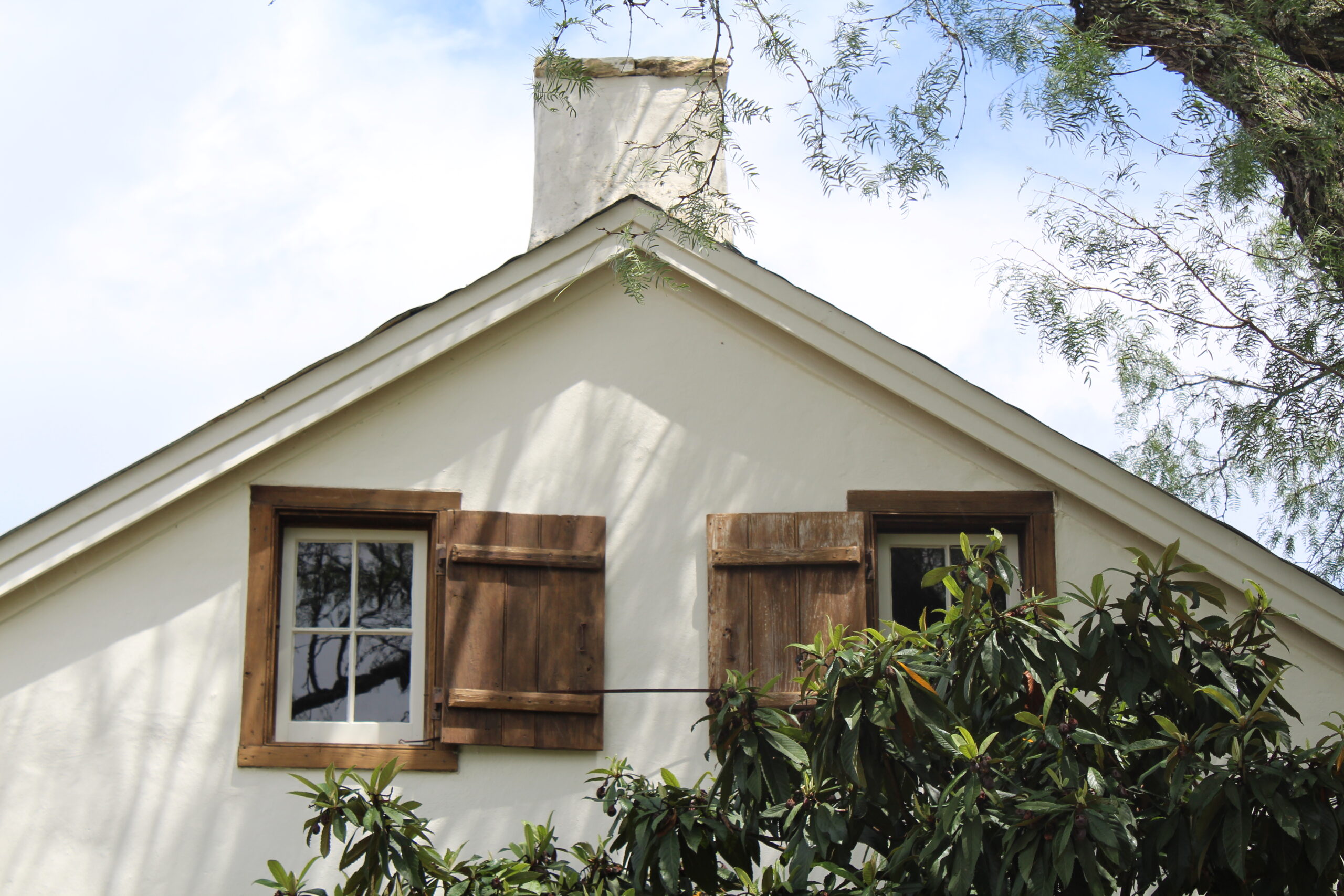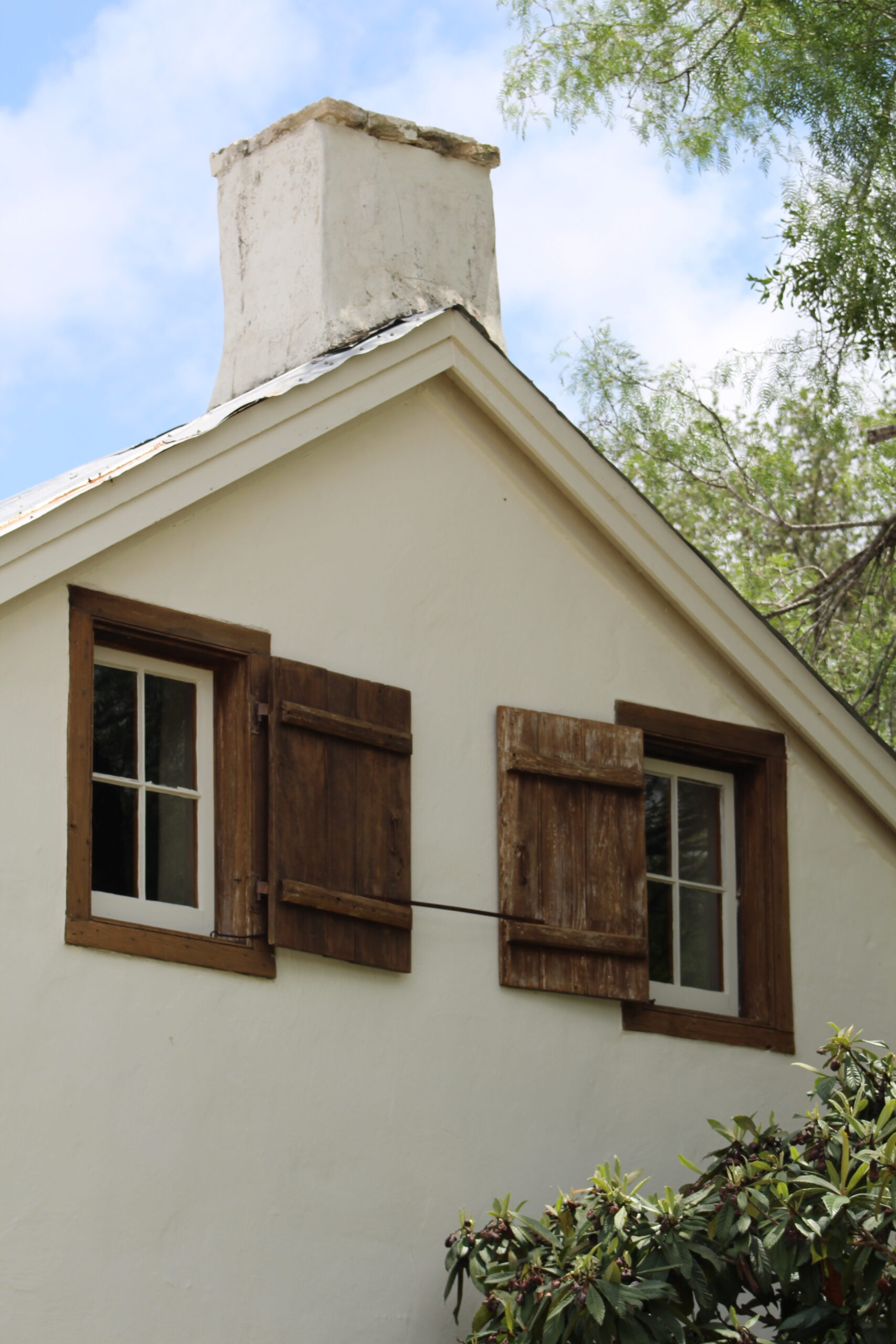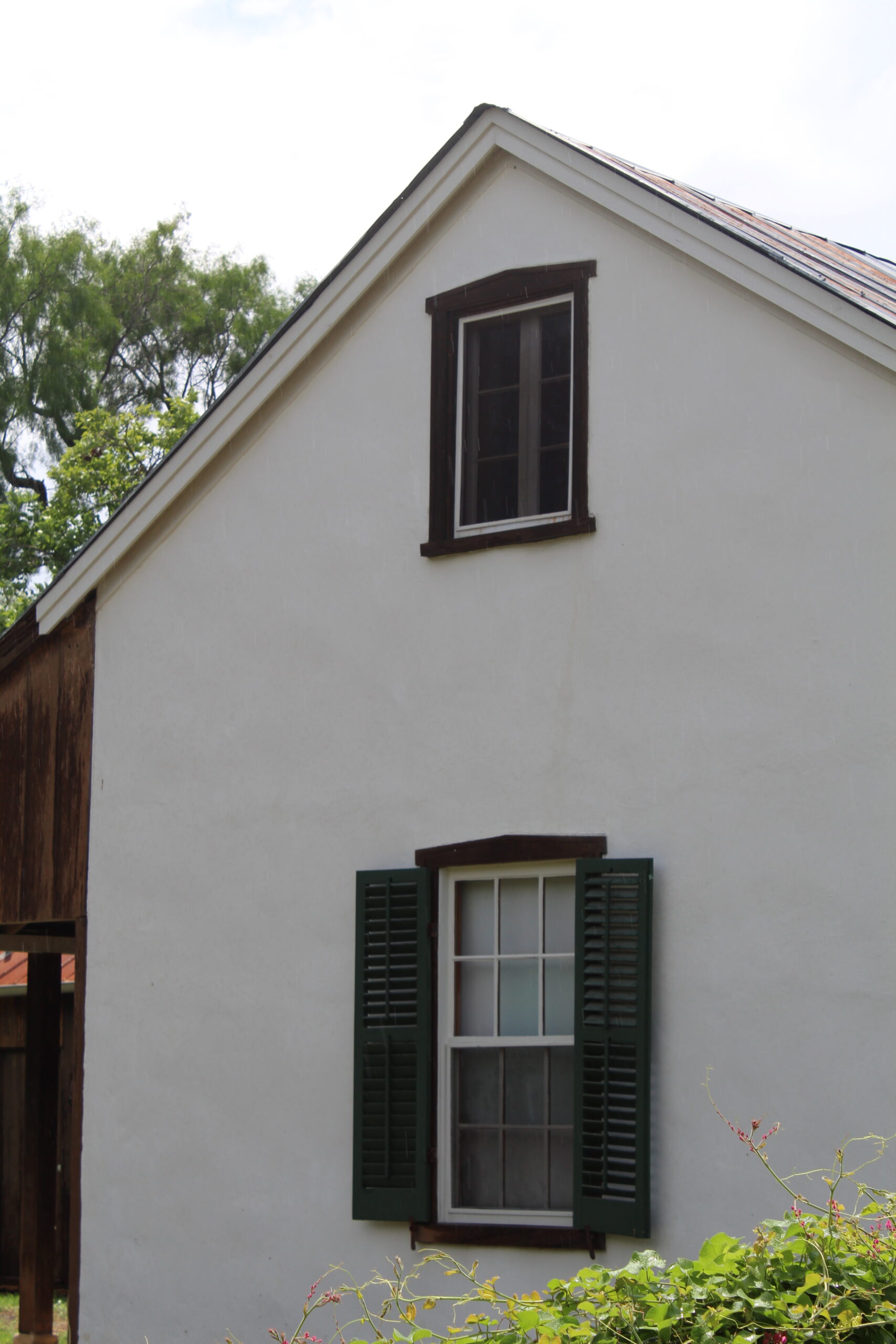The home is supported by a thick, stone mass wall and stuccoed. The oldest part of the home is 1.5 stories with an original wooden stair from the living room to the attic. The centered attic window on one face is a casement window with a significant splay. The two attic windows on the other face have four panes and a single shutter. The window on the first floor of this facade is centered. The difference in window type suggests that both attic facades once had a singular, centered window.