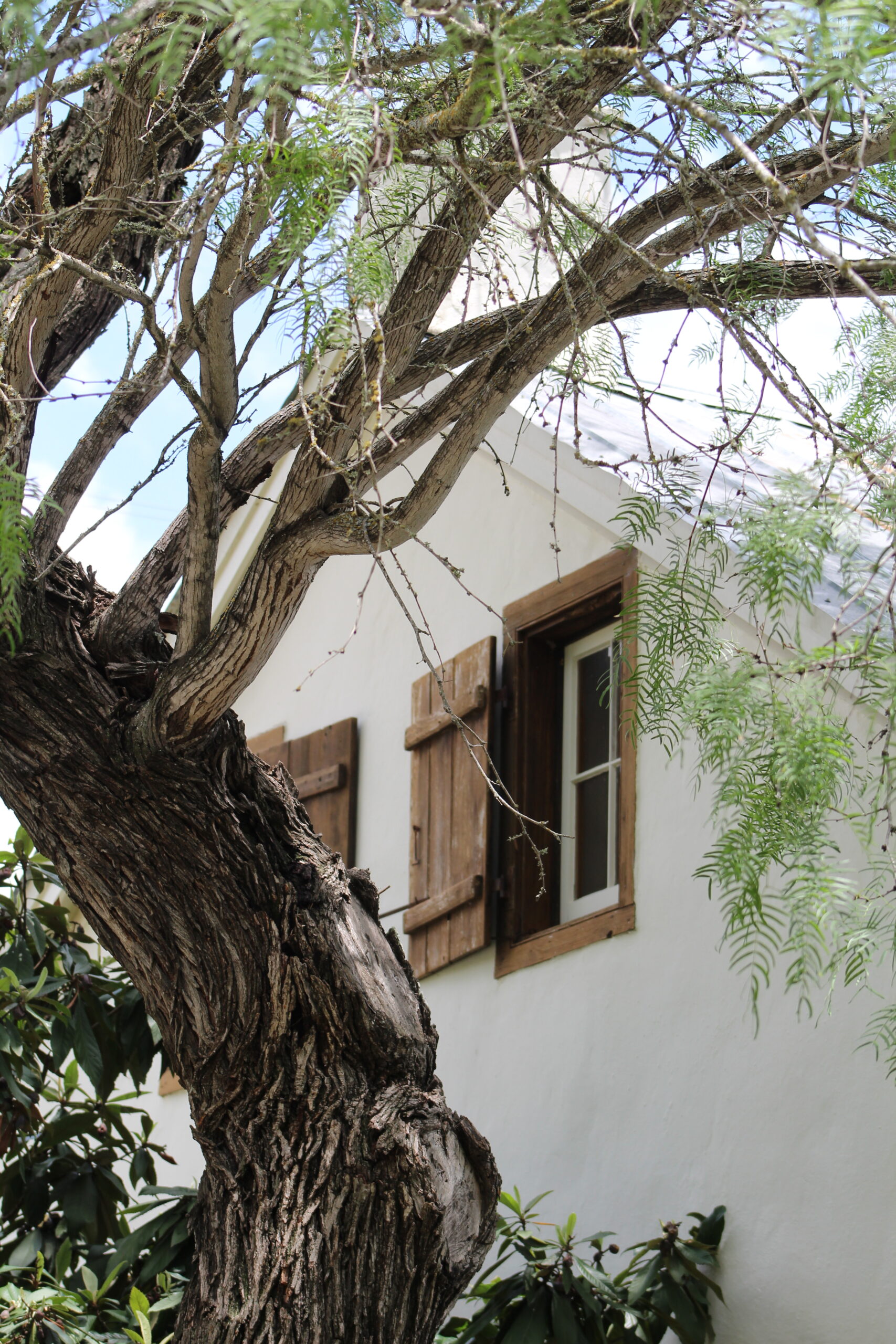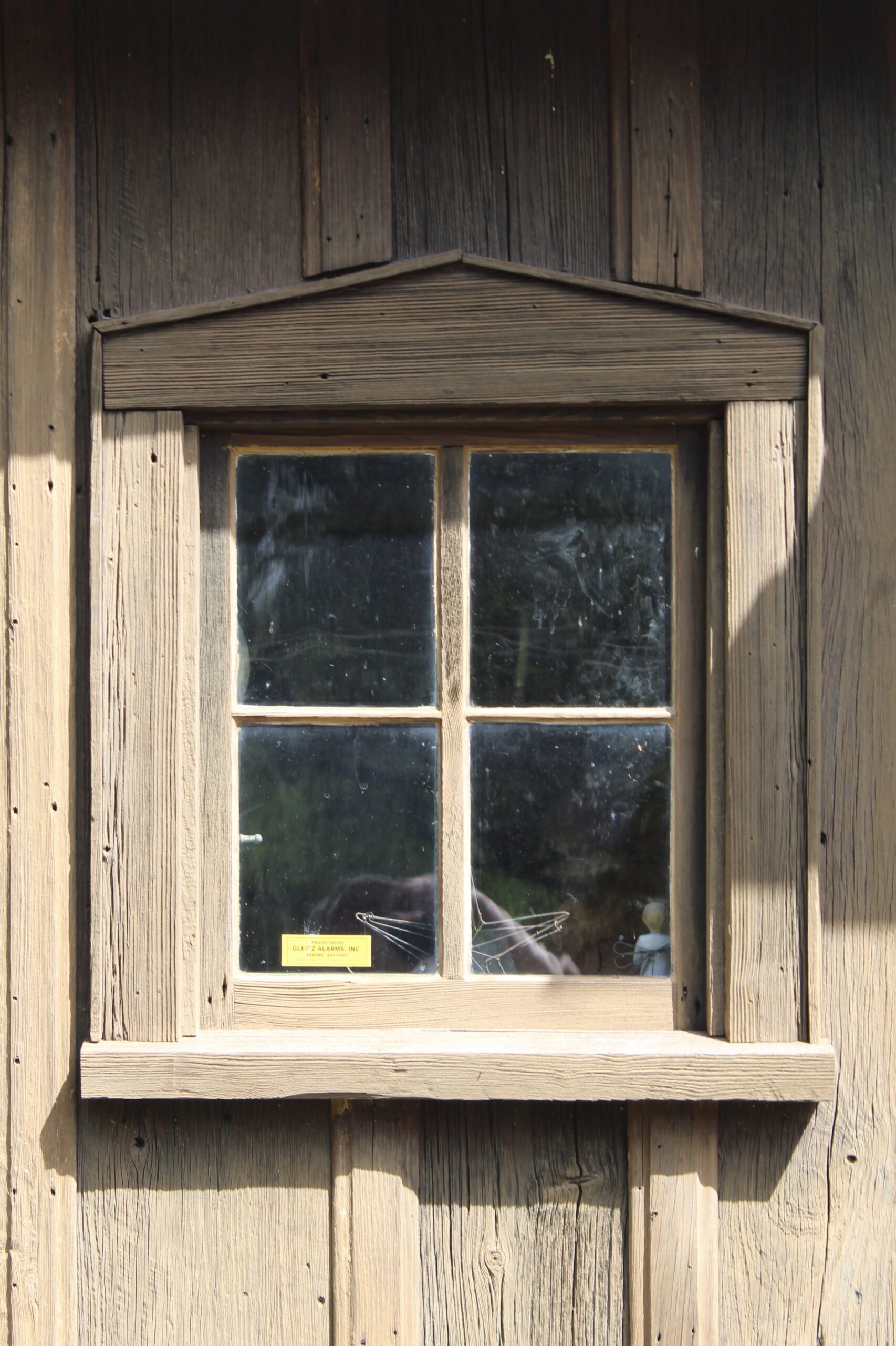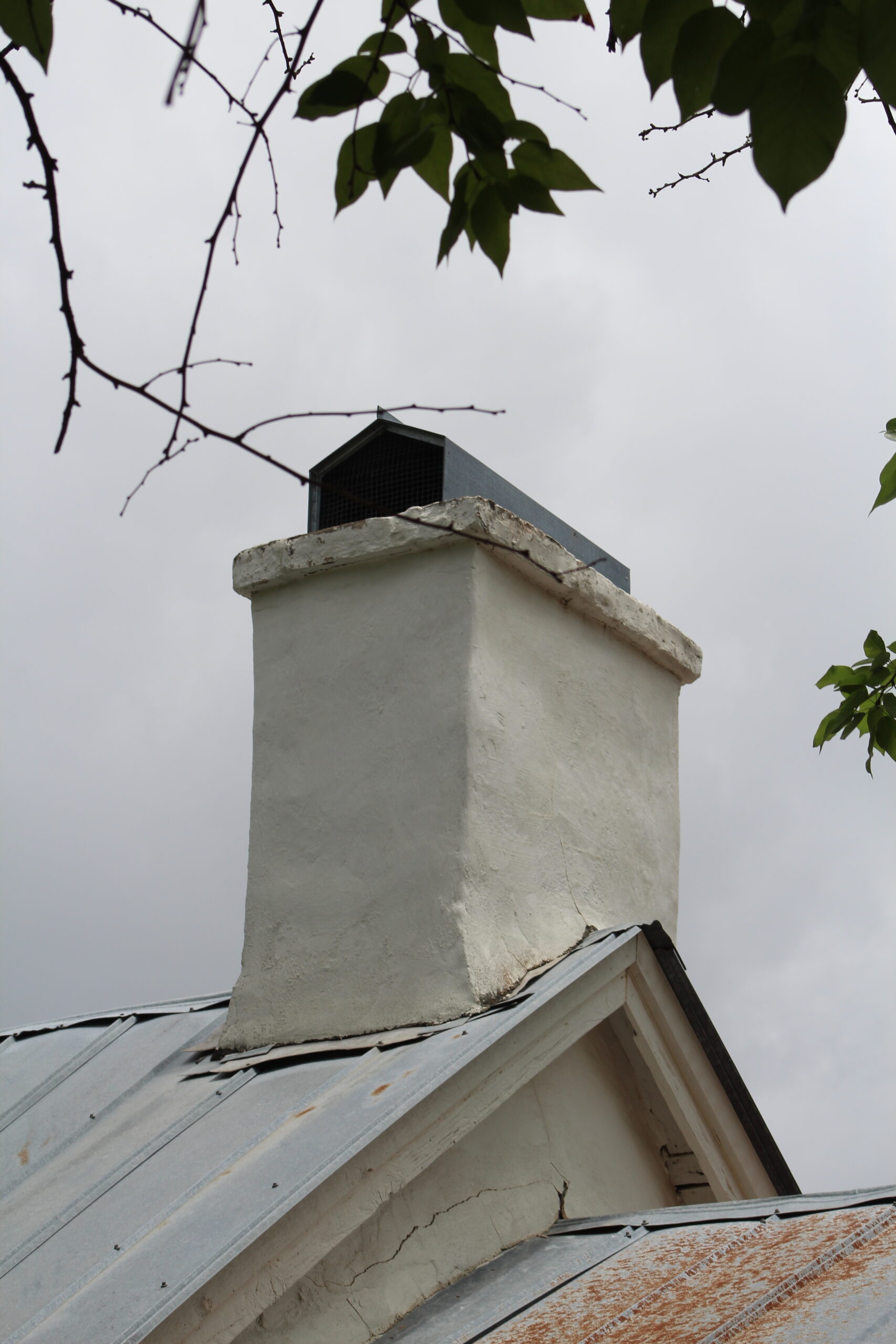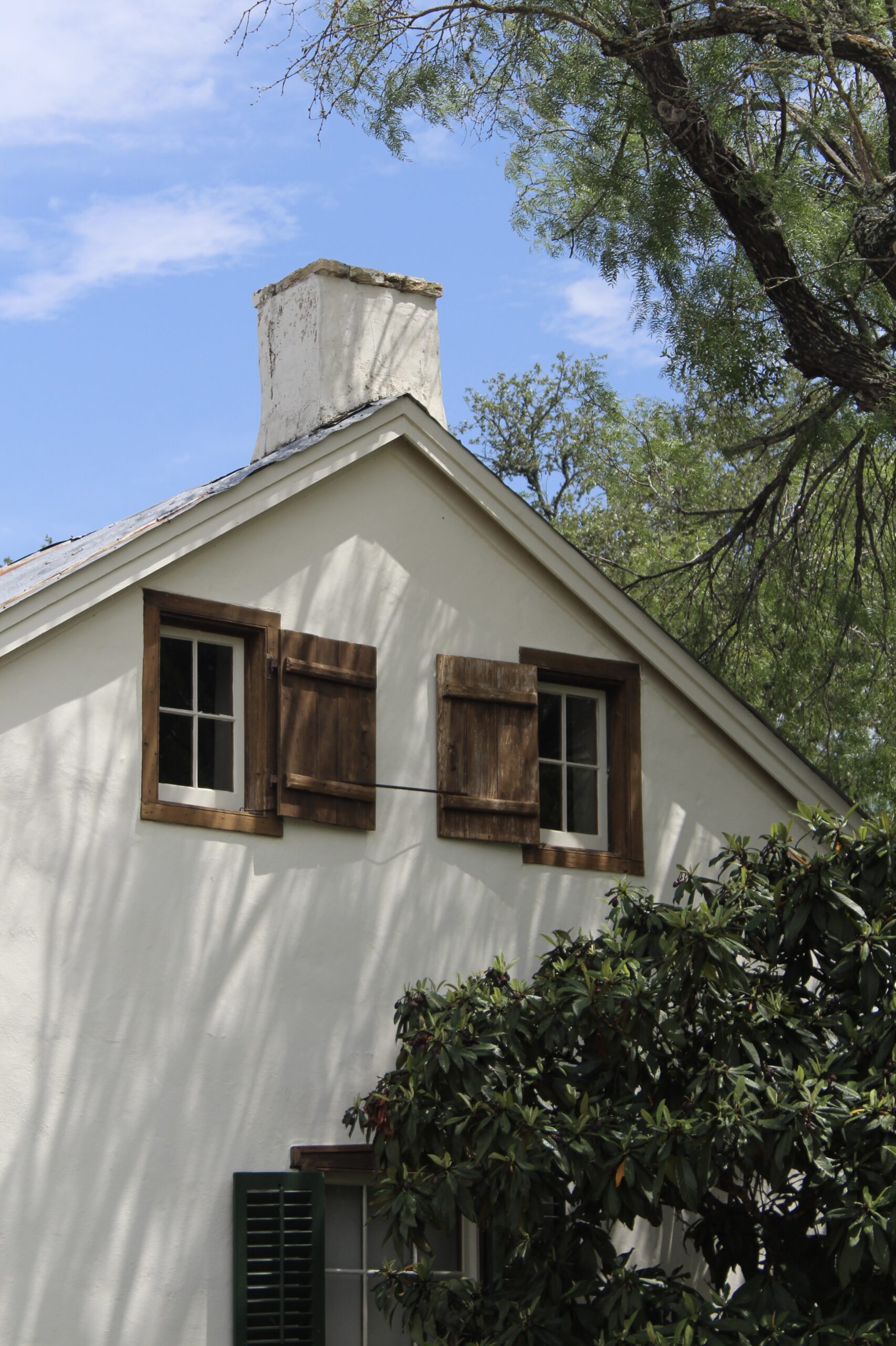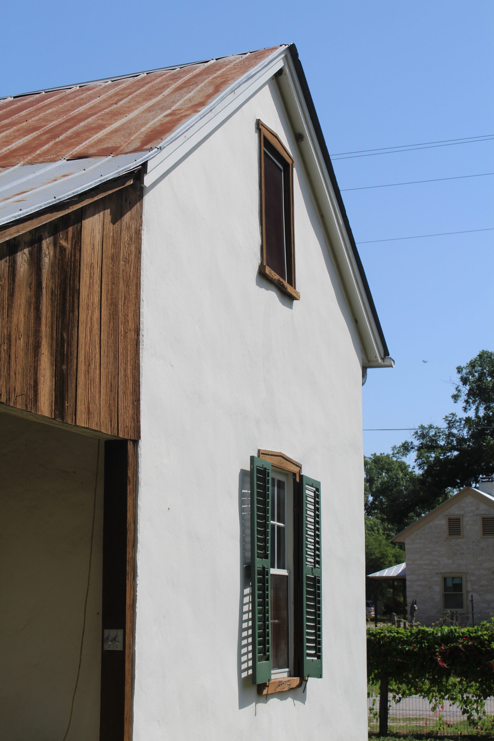 The home is supported by a thick, stone mass wall and stuccoed. The oldest part of the home is 1.5 stories with an original wooden stair from the living room to the attic. The centered attic window on one face is a casement window with a significant splay. The two attic windows on the other face have four panes and a single shutter. The window on the first floor of this facade is centered. The difference in window type suggests that both attic facades once had a singular, centered window.