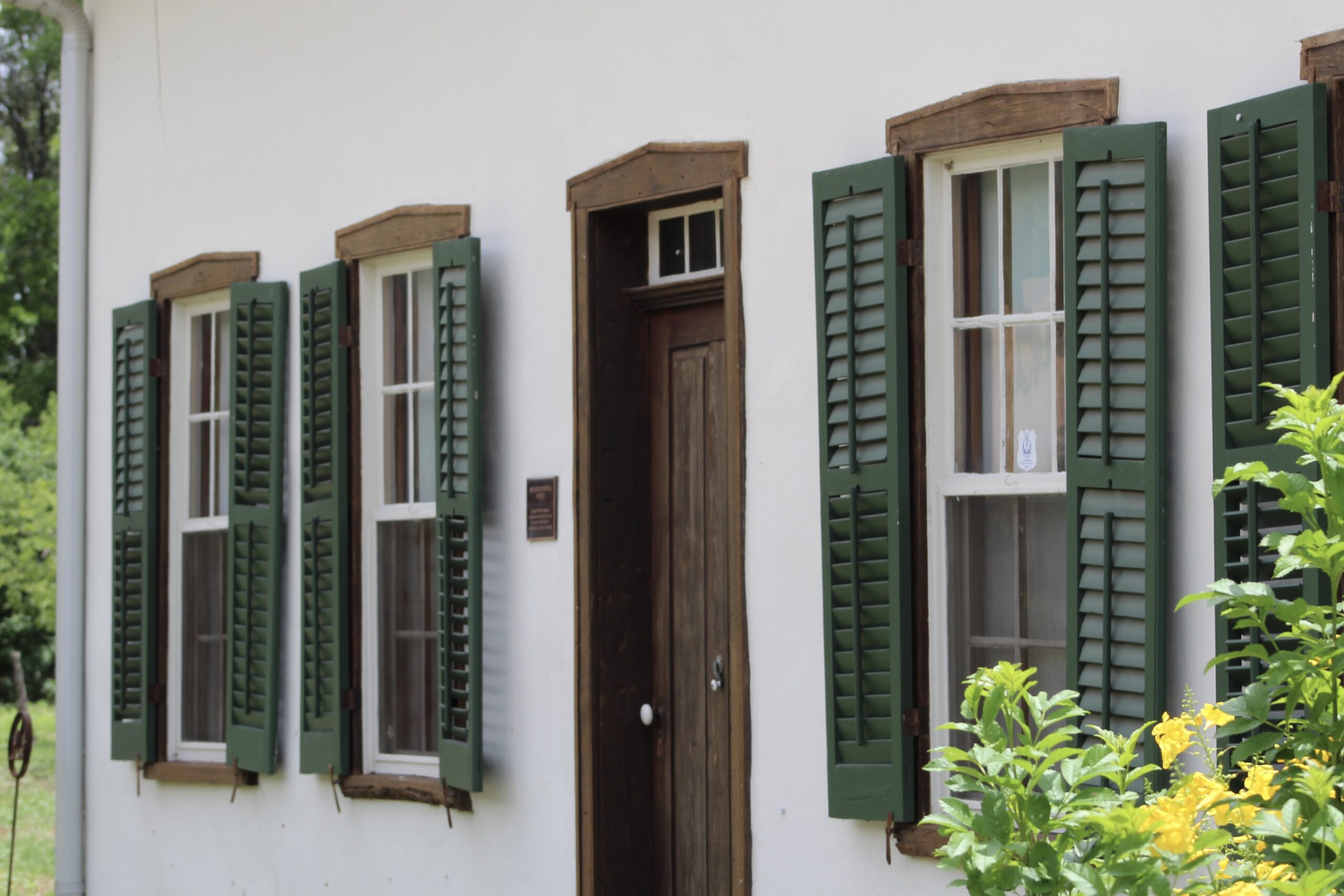 The Arcadius-Steinle house is a symmetrical, five-bay home with a centered front door. The windows are double-hung and framed by shutters. The front door is capped with a transom window. It has a side-gabled, metal, standing seam roof with a chimney on its peak on one side.