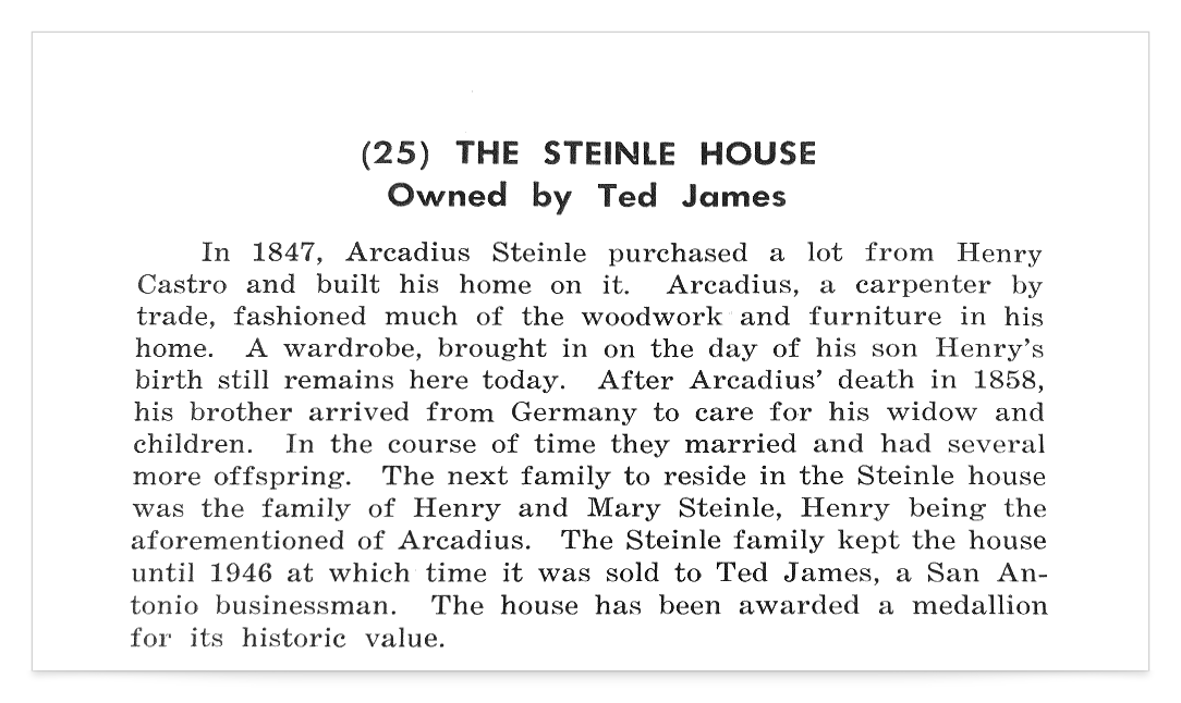 Arcadius Steinle purchased the lot from Henri Castro in 1847 and built the home. A carpenter by trade, Steinle built much of the furniture and woodwork in the home, including a wardrobe that remained, as noted in 1968 (Castroville’s Historical Heritage book).